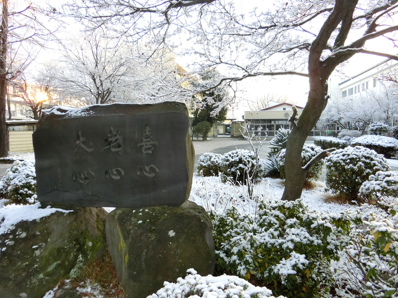 長野市鶴賀の「東通り」沿いにある。裾花川扇状地(せんじょうち)の上にあり、近くには古い裾花川の流れの跡(旧流路/きゅうりゅうろ)がみられる。写真は、学校教育目標になっている「三心の教え」。