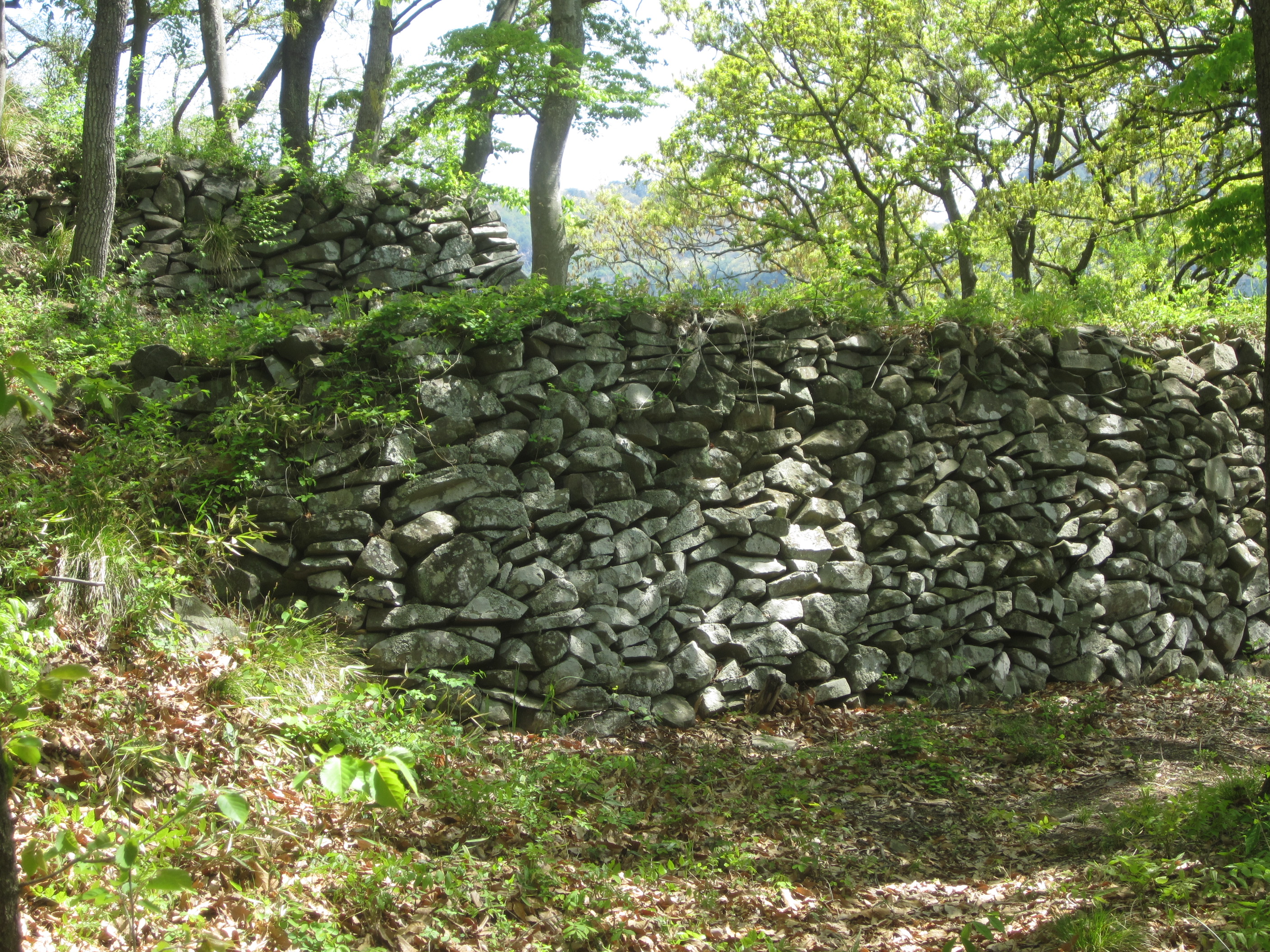 長野市松代町大室にある中世城館跡。長野盆地では千曲川の右岸(東側)に非常に特徴的な石垣を用いた城が残っている。その中でも霞城にはほぼ垂直な2メートルを越える石垣が残っている。中核部北西側に残る石垣のアップ。