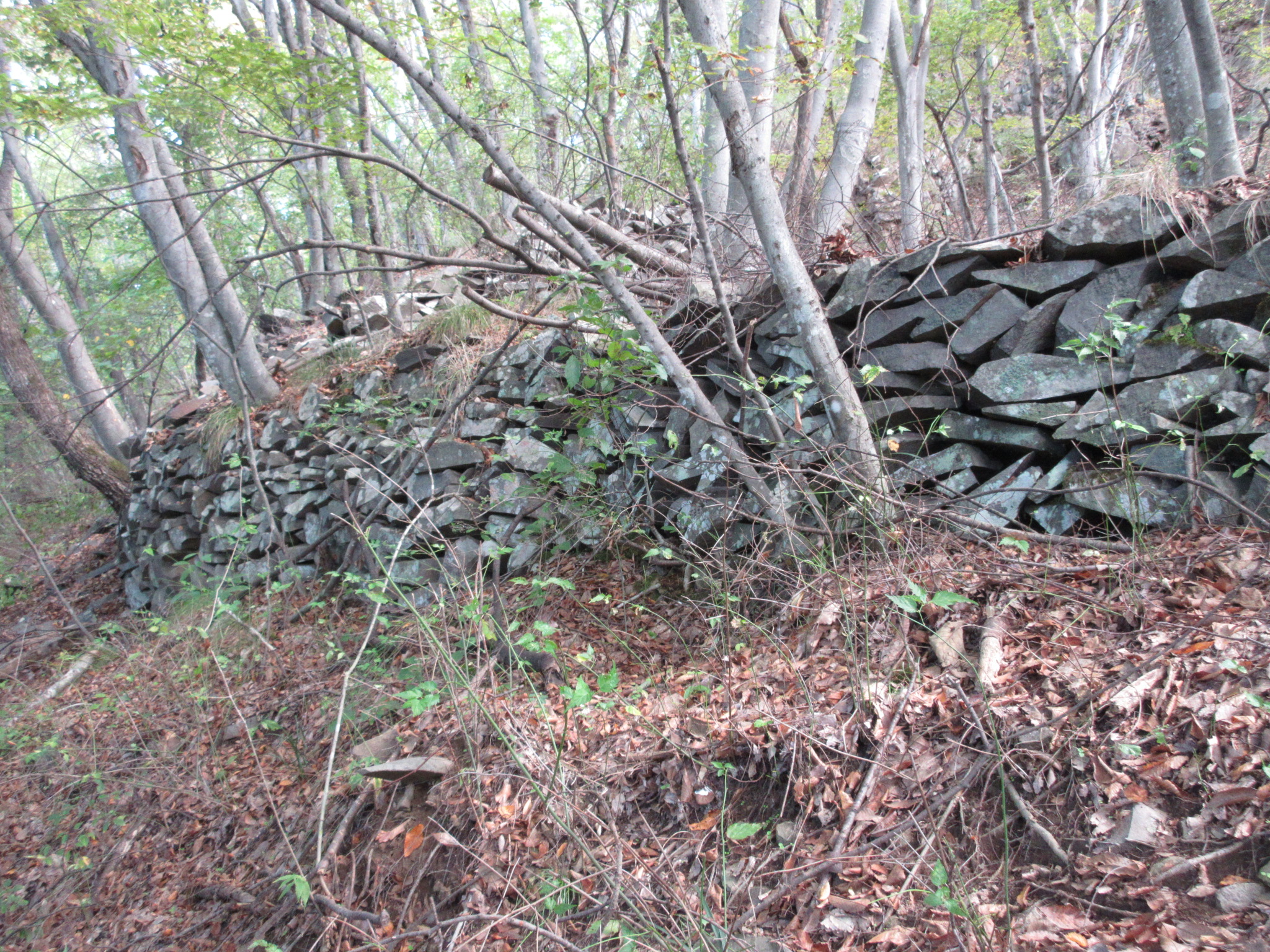 長野市松代町大室にある中世城館跡。長野盆地では千曲川の右岸(東側)に非常に特徴的な石垣を用いた城が残っている。その中でも霞城にはほぼ垂直な2メートルを越える石垣が残っている。写真は南西側中腹にある「石門」と呼ばれる部分に残る土塁外側の石垣。中核部の石垣と比べると技法に差があるようで、この城では何度も石垣普請(いしがきぶしん)が行われた可能性がある。