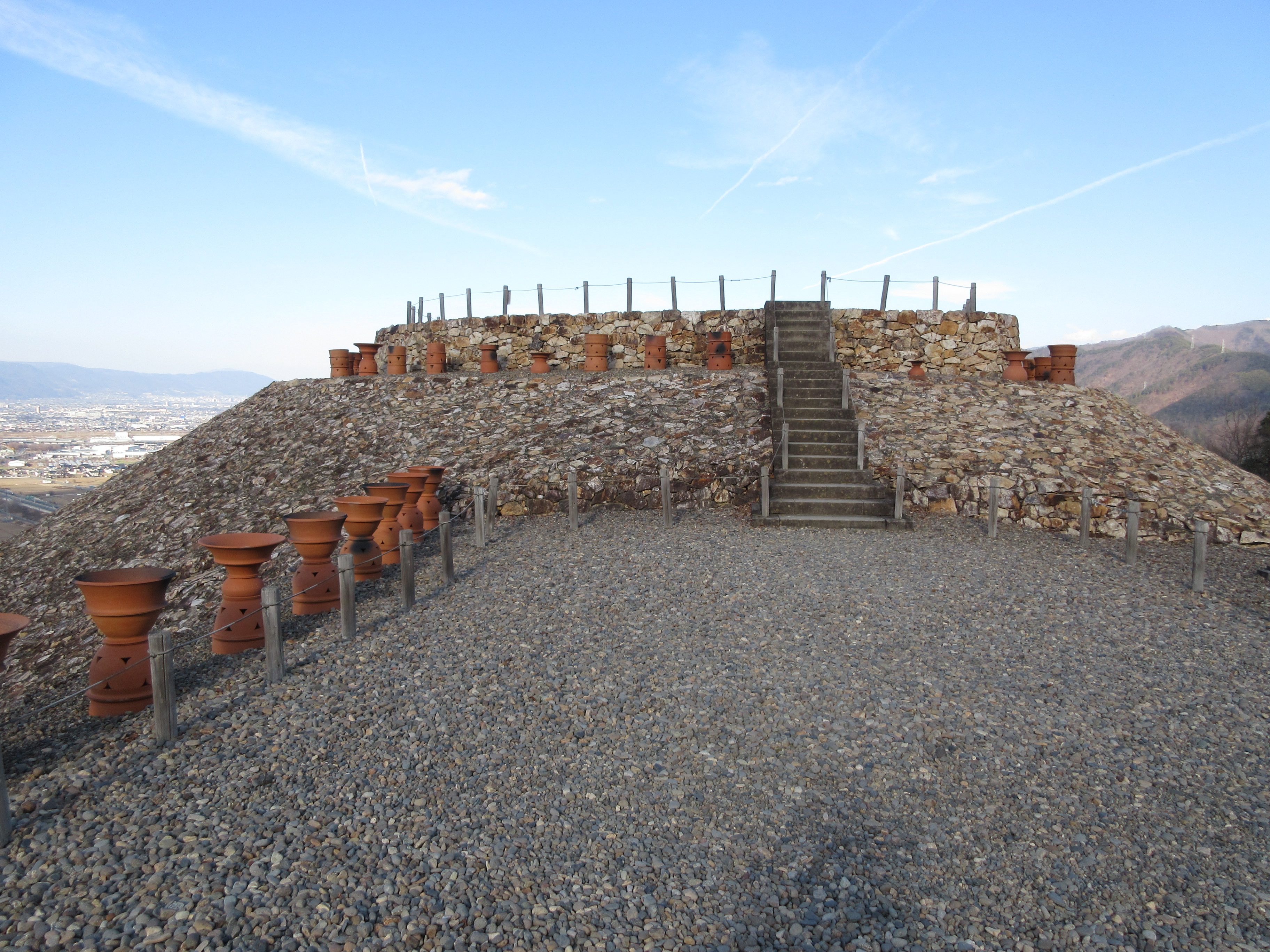 基本的に前方後円墳の主な被葬者(ひそうしゃ/葬られた人)は後円部に葬られるので、祭礼のために訪れた者は前方部で儀式(お参りなど)を行ったであろう。森将軍塚古墳の前方部に立って後円部を見ると写真のような景観になる。