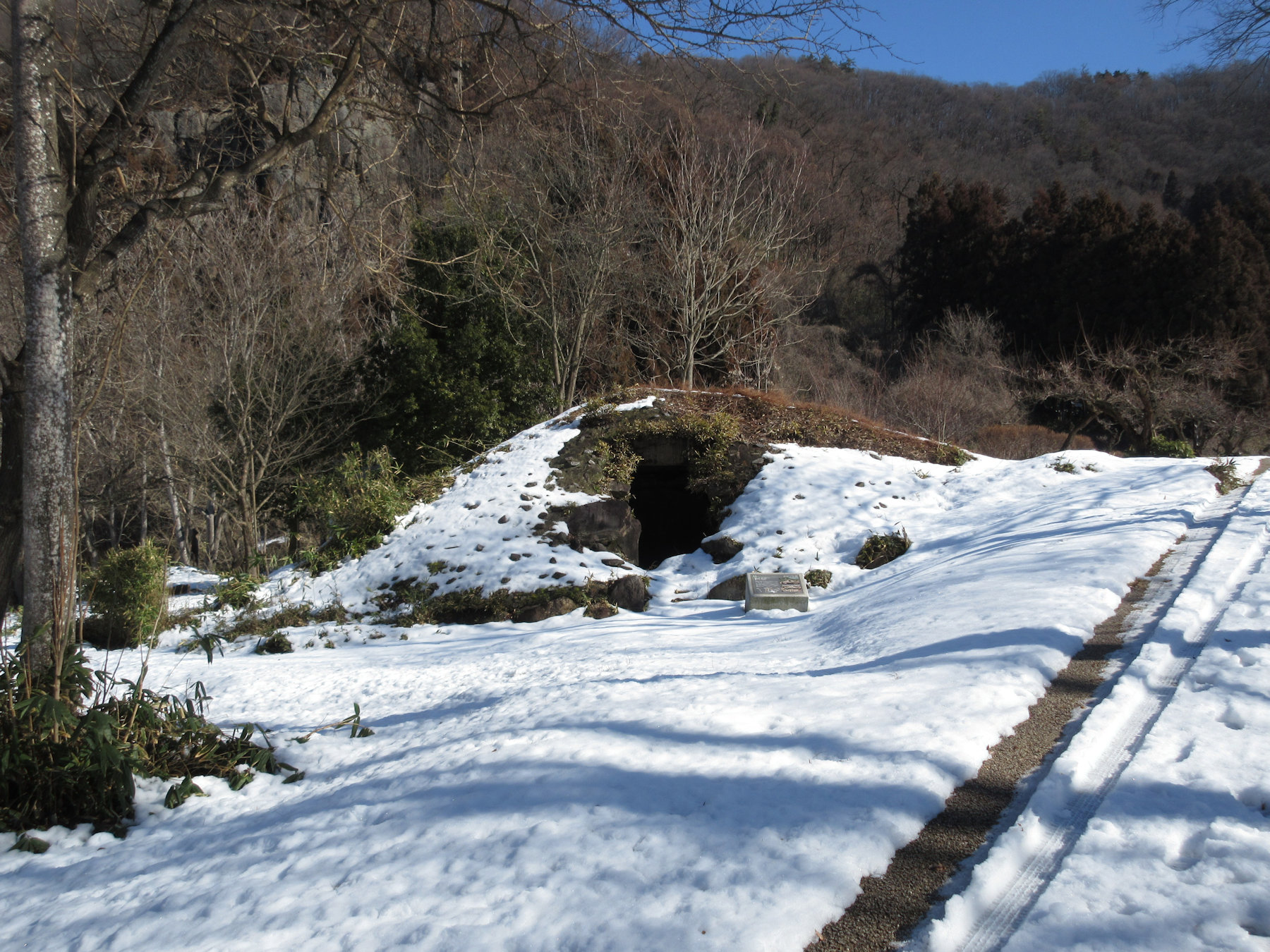 「横穴式石室(よこあなしきせきしつ)」も大陸の古墳とつながりが深いとされ、わが国で全国的に広がったのは6世紀ころと考えられており、大室古墳群でも「合従形石室」に続いて現れたと考えられている。それより前の時代に築かれた森将軍塚古墳(千曲市)や川柳将軍塚古墳は、「竪穴式石室」という構造で、古墳の上から掘った穴の中に亡くなった人を葬るため、家族などを後から同じ墓に葬る(「追葬」という)のが難しい。その点、横穴式石室は、トンネルのような通路の入口を石の扉で塞ぐ構造なので、後から別の人(家族や子孫など)を葬りやすく、発掘でそれが確認された例も多い。写真の例は、通路部分(「羨道」という)が破損していたため、発掘後に土と石を混ぜて築いた墳丘の内部を観察できるように整備し、石室に続く横穴がよく見えている。