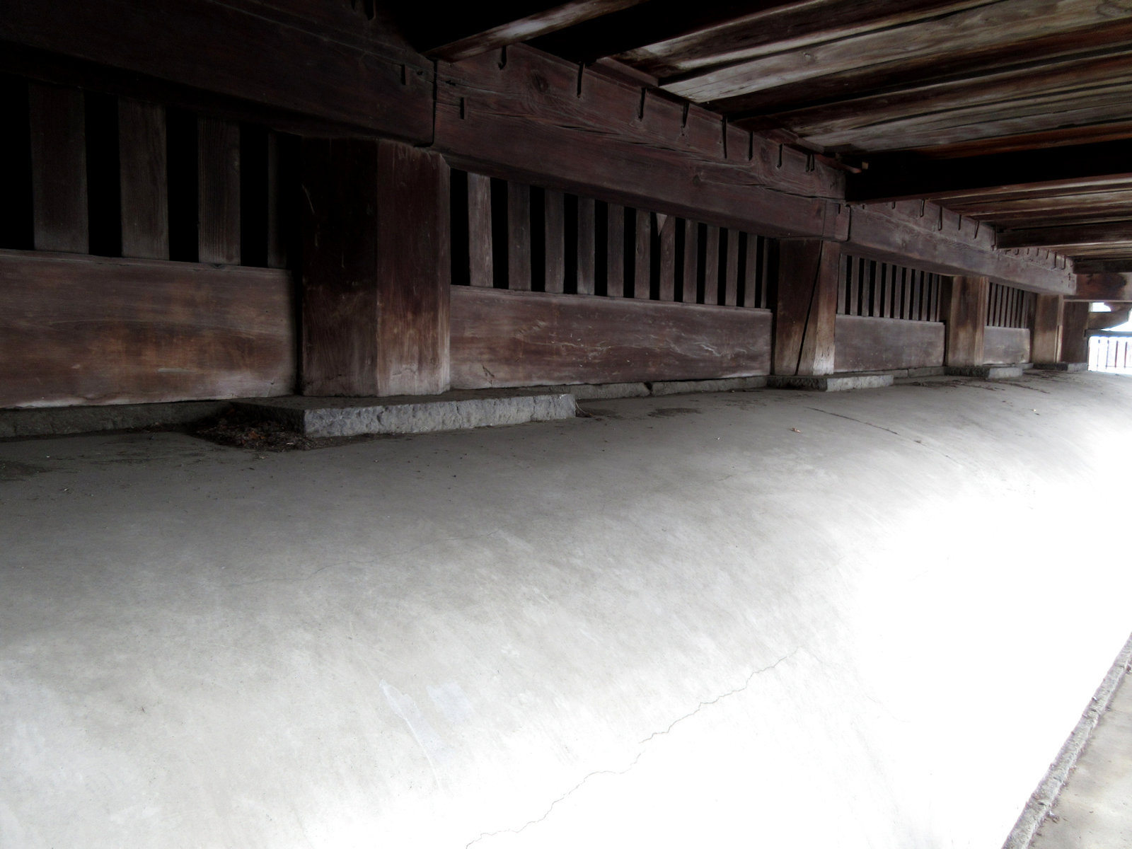 この亀腹(かめばら)は善光寺本堂の土台である。こういうものがどうして作られるようになったのかについては、いくつか説がある。その中のひとつに、奈良時代の宮殿や寺院の建築で、土を叩(たた)いて固めた「基壇(きだん)」が進化して、建物と一体になったのではないかという考え方がある。門前町が潰滅(かいめつ)した善光寺地震(1847年)のときにも本堂は無事だったが、その理由の一つに、この亀腹による土台(基礎/きそ)がしっかりしていたこともあげられている(ほかに、柱の数が多いことなどもあげられている)。【この画像は二次利用(授業の目的以外で使うこと)が禁止されています。】