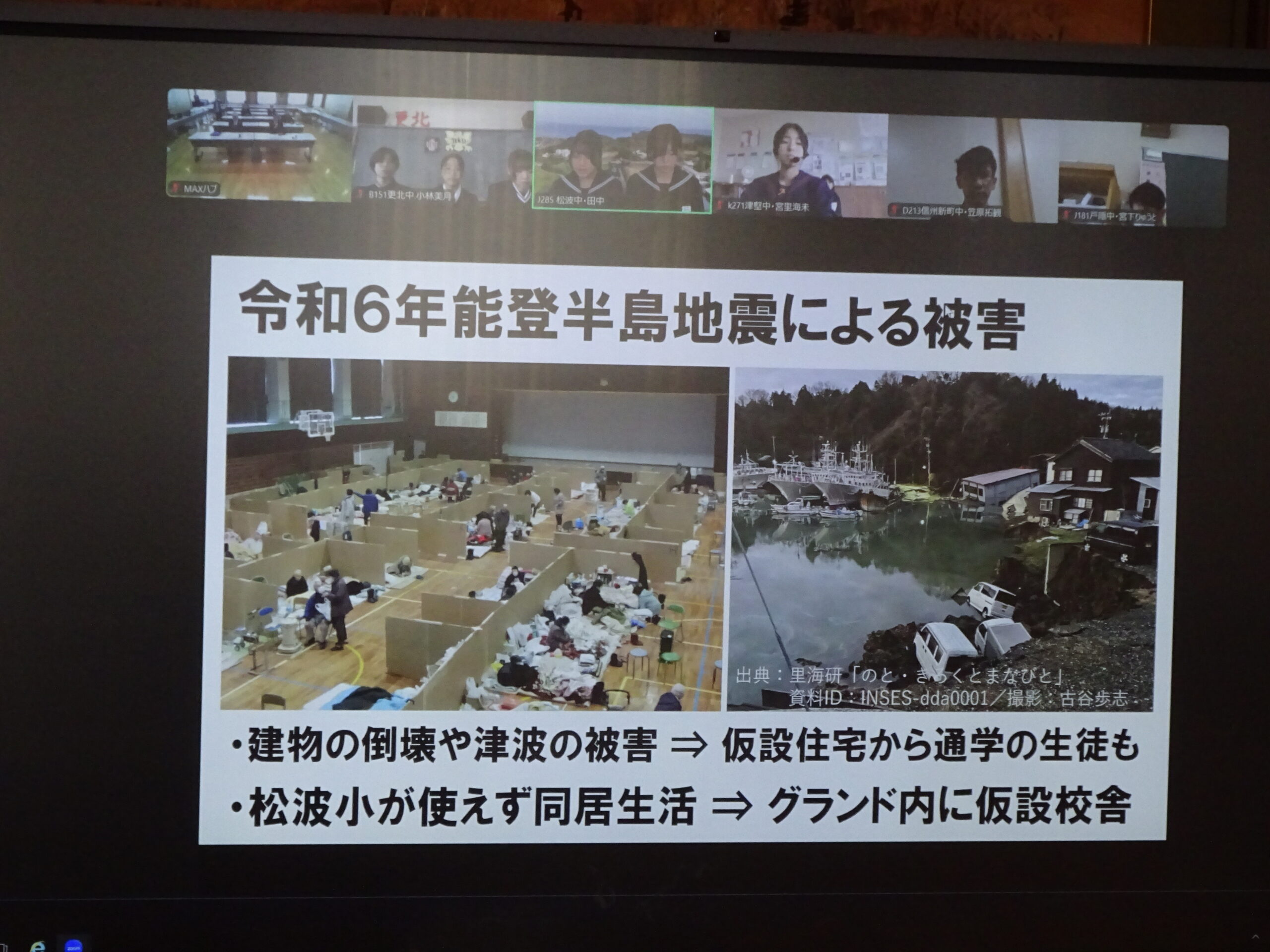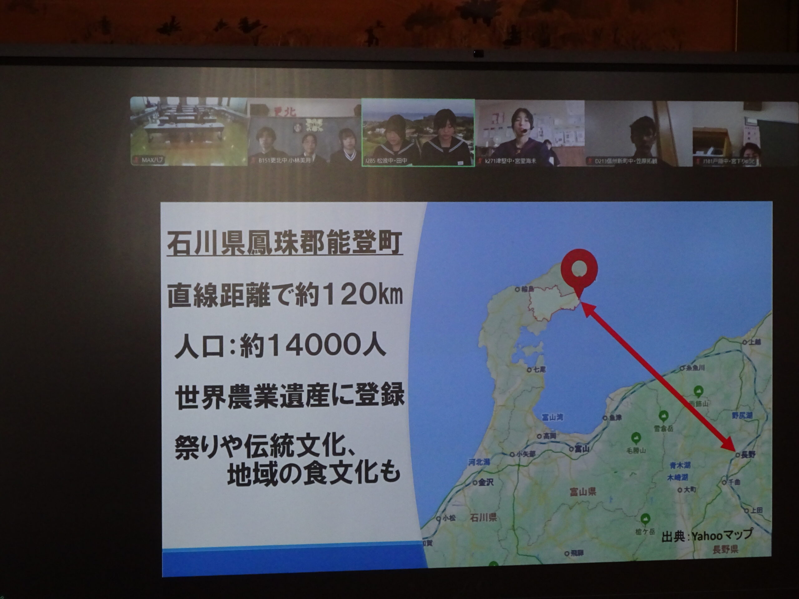 第1部のスタートは、石川県能登町立松波中学校のみなさんの学校紹介でした。長野市から直線距離で120㎞の場所に位置する松波中学校は海と山に囲まれた自然豊かな町にあり、令和6年の能登半島地震の被害を大きく受けた学校です。