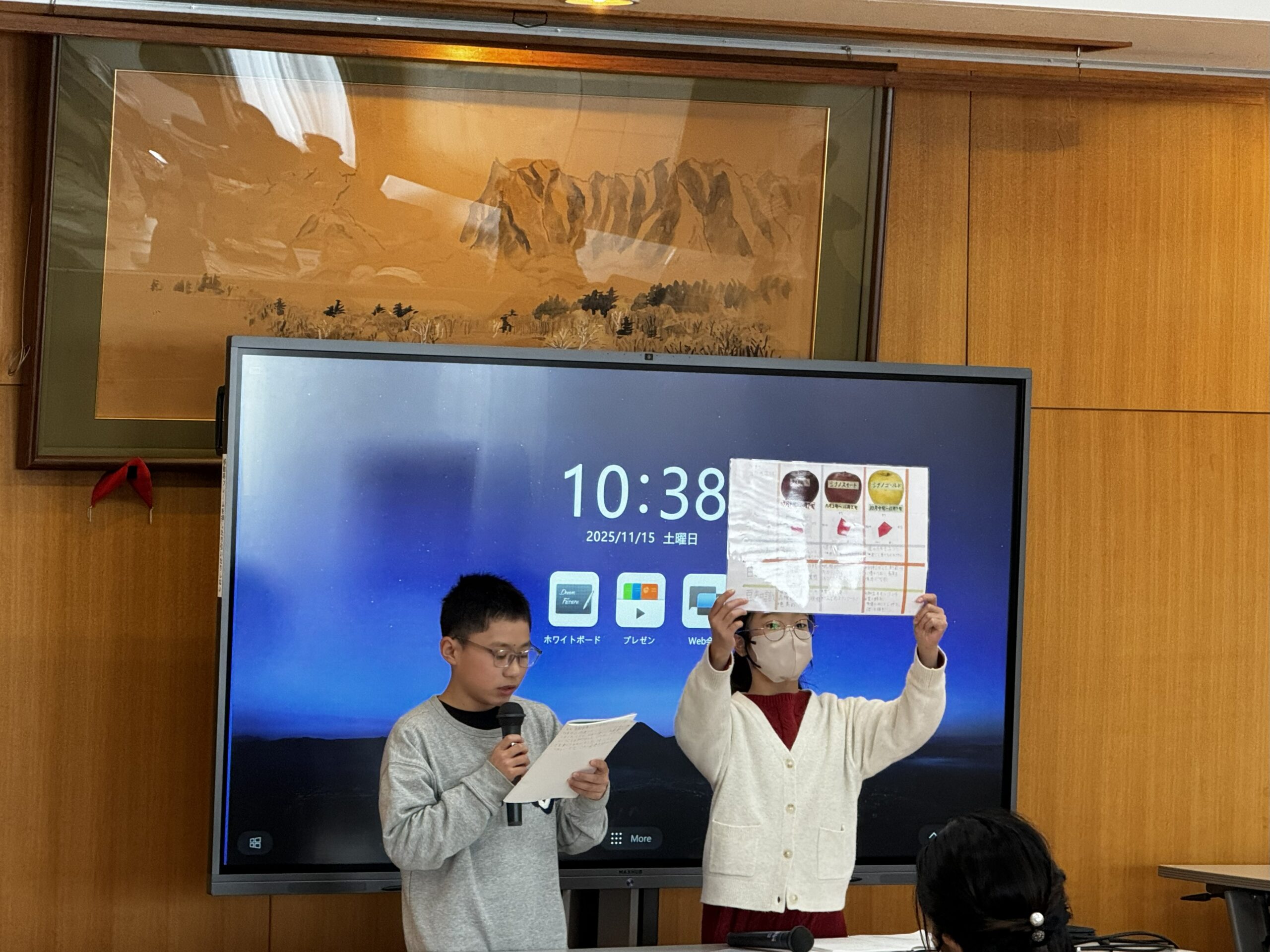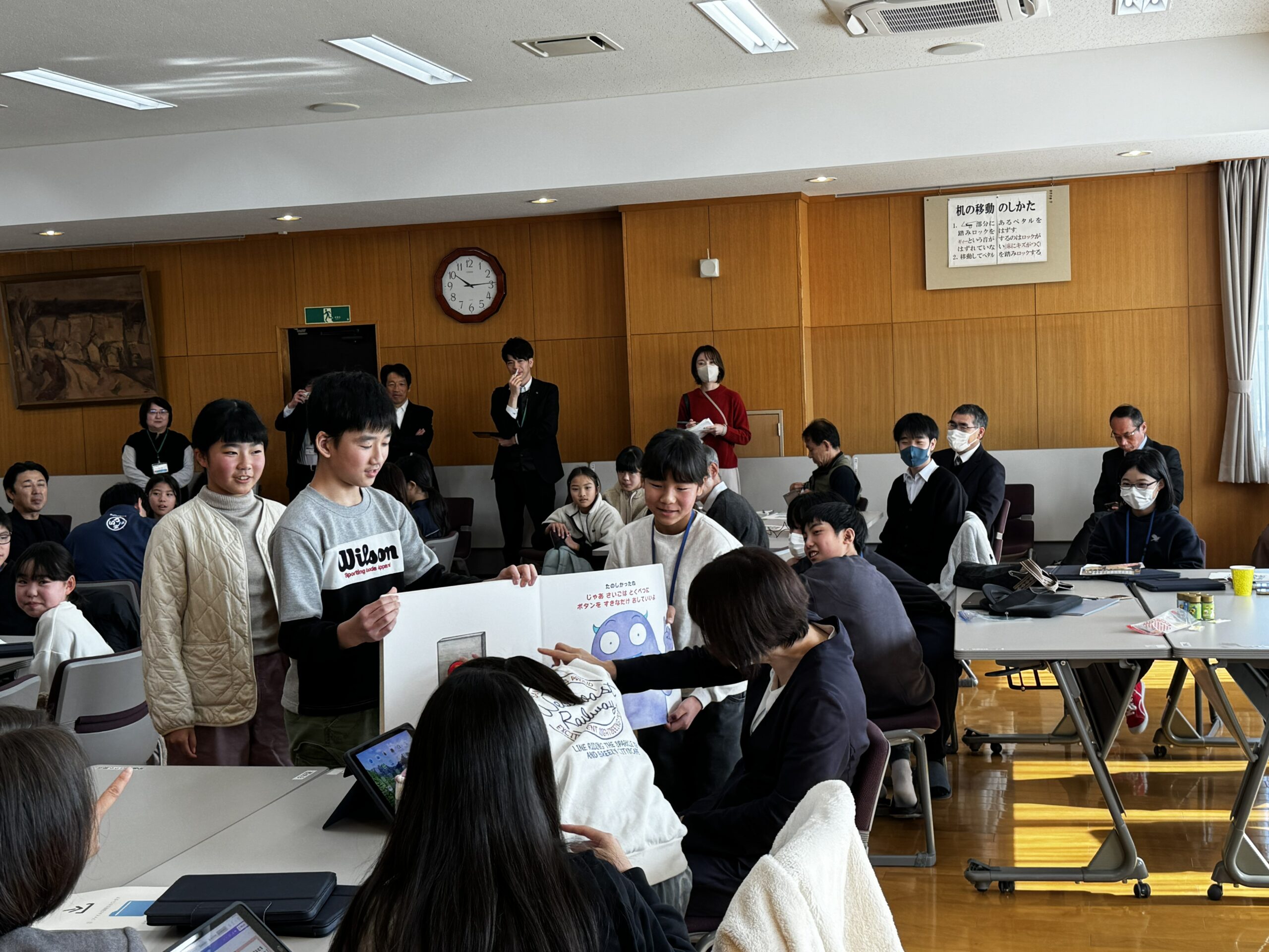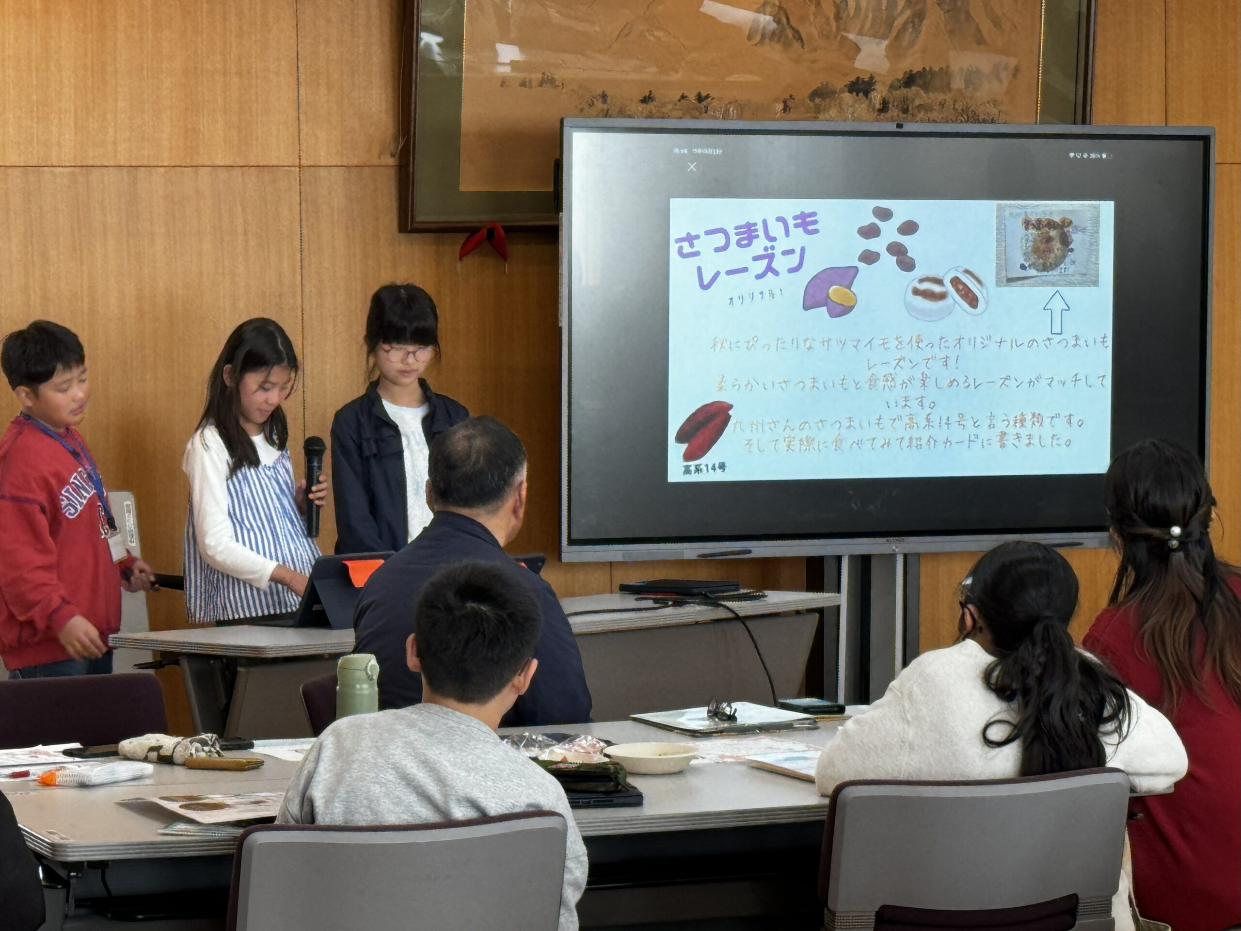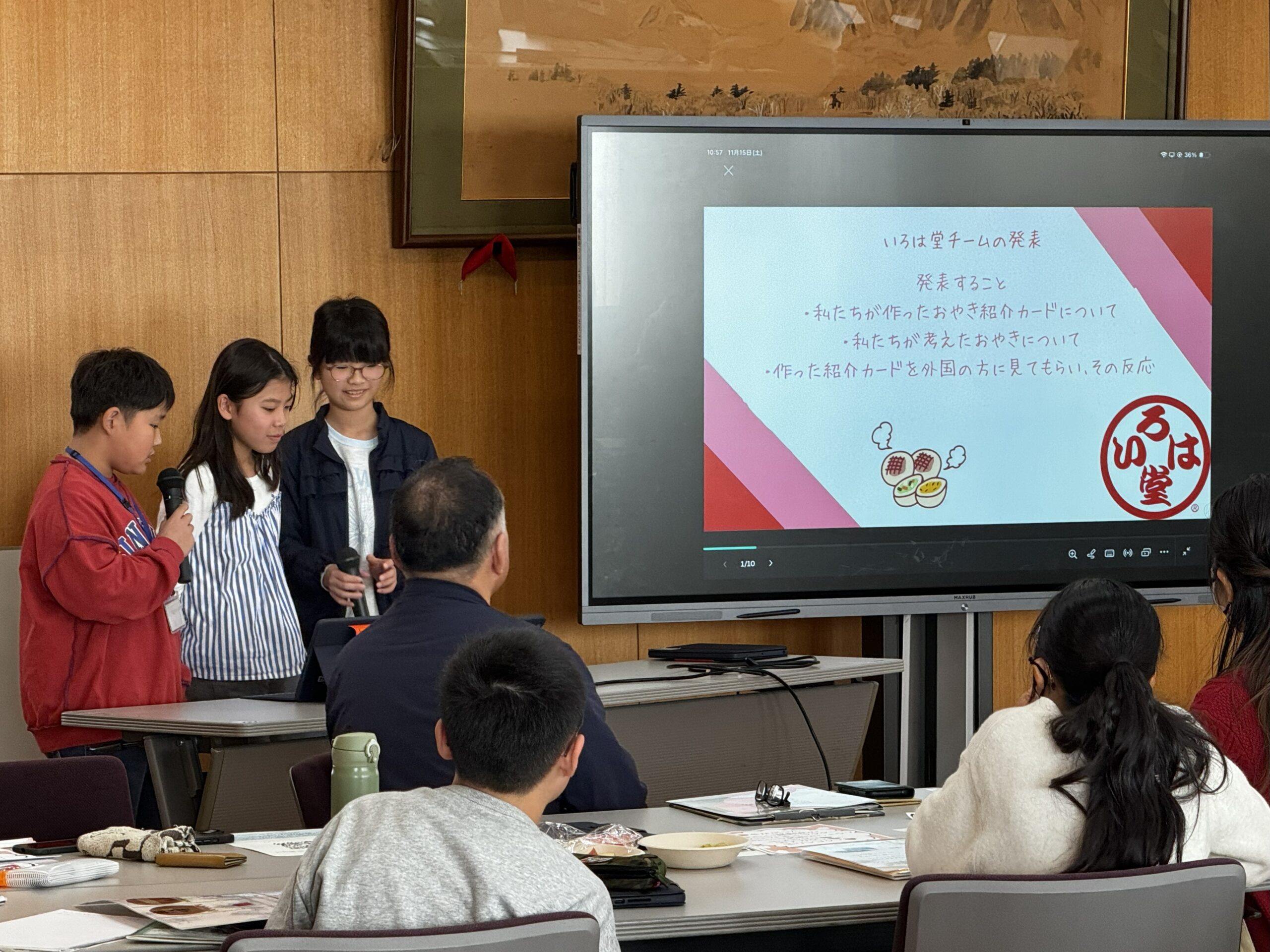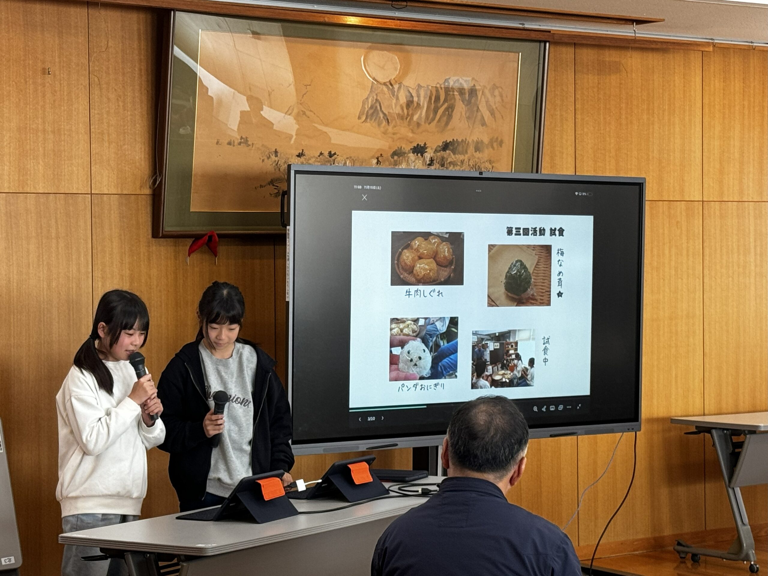 「長野県の郷土食のおやきを県内外の方や海外の方にも広く食べて知ってもらうためにできることを考えよう」という願いのもと、英語のおやき紹介カードを作ったり、自分たちで考えた一口サイズのさつまいもレーズンおやきを実際に作ったりしました。報告会では、自分たちで考えたオリジナルおやきについて、自分たちが作ったおやき紹介カードを見た外国人の方の感想等を発表したり、子どもたちが考えた一口サイズのオリジナルおやきを会場の皆さんに試食してもらったりしました。「おやき紹介カードを見た海外の方の反応がかなりよかった」「とても良い体験になったし、とても楽しかった」「今回の経験を生かしてこれからも頑張りたい」という感想がありました。