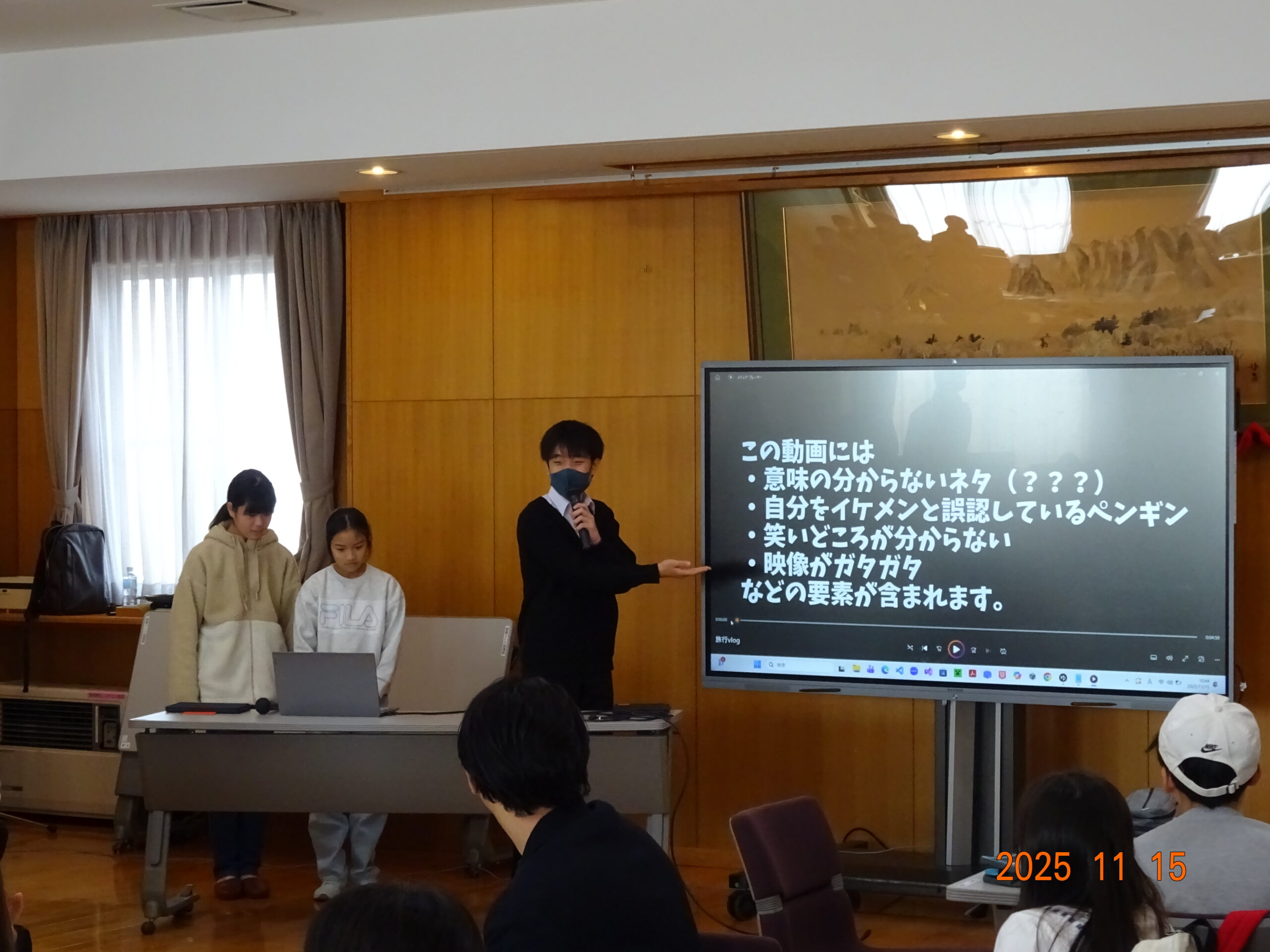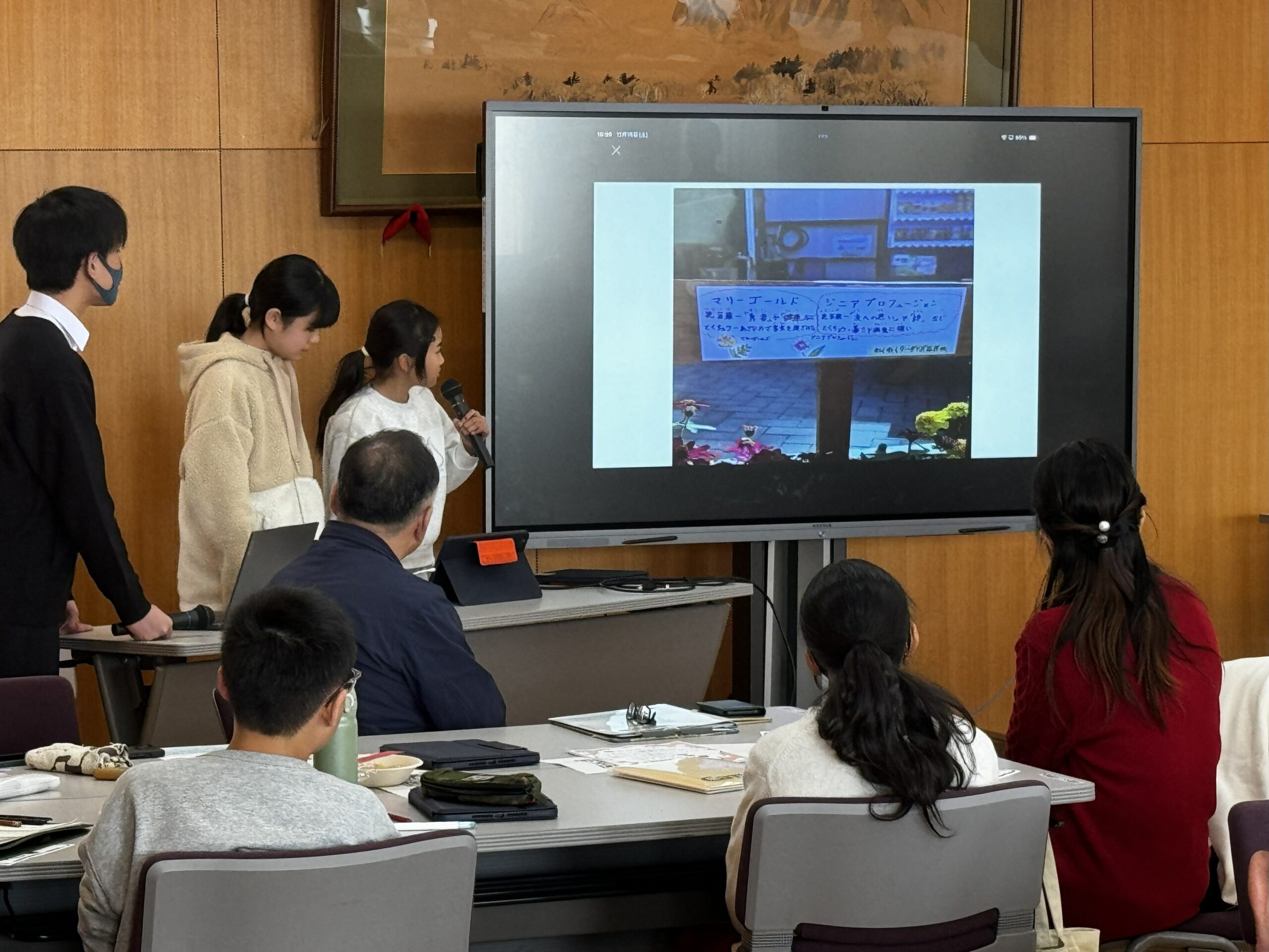 「地域の身近な動物園を大人も子どもも楽しめる場所にしょう」という願いのもと、動物園のPR動画を作成して動物園で放映したり、来てくれた人が楽しめるように花壇作りを行ったりしました。報告会では、新たに2本目の動物園PR動画を発表したり、花壇作りの様子を感想と共に発表したりしてくれました。「大人にはない発想力をたくさん発揮し、理想を思い描いて実現する力に驚かされた。笑顔で楽しく、時に真剣にというメリハリをつけた行動も凄かった。参加してよかったし、楽しかった」「動物だけでなく花も見てほしいし、子どもだけでなく大人にも楽しんでほしい」「城山動物園で花を植えたりした事で、これからもお客さんに来てもらいたい」という感想がありました。