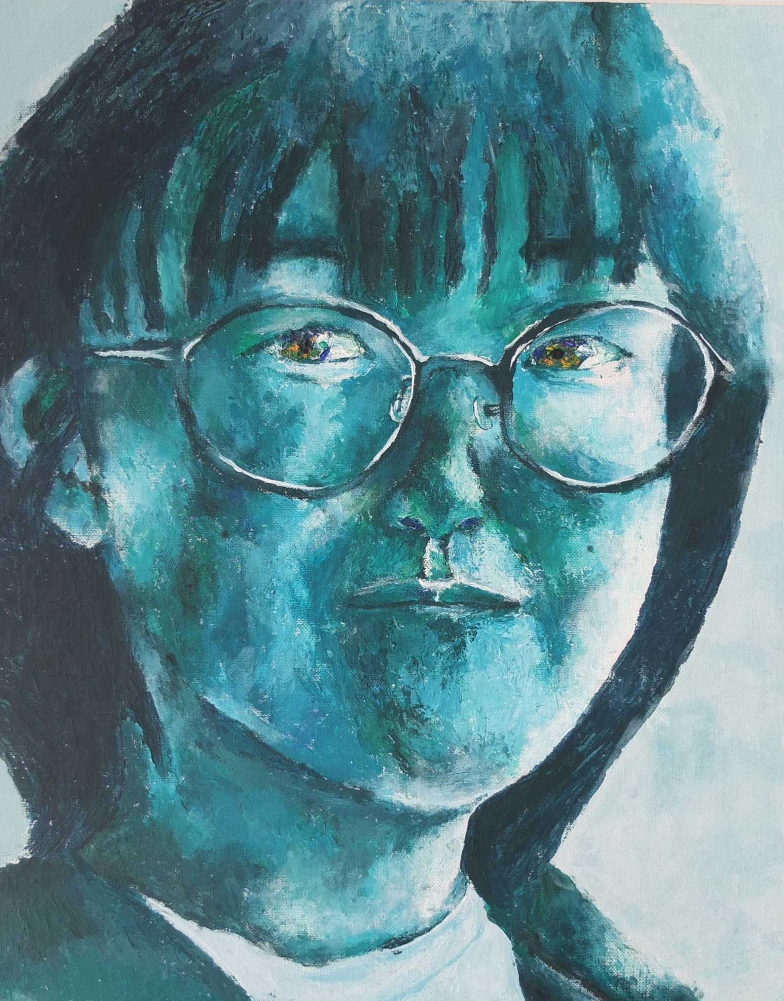 私はこの絵で「自分」を表現しました。私はとても優柔不断なので良くも悪くも笑っているのか真顔なのかわからない表情に工夫しました。特に目の形や口の形などは、下描きから何度も自分と見比べて描きました。他に工夫したところは、光の入れ方です。特に顔のやわらかな光の部分は指を使って工夫しました。
