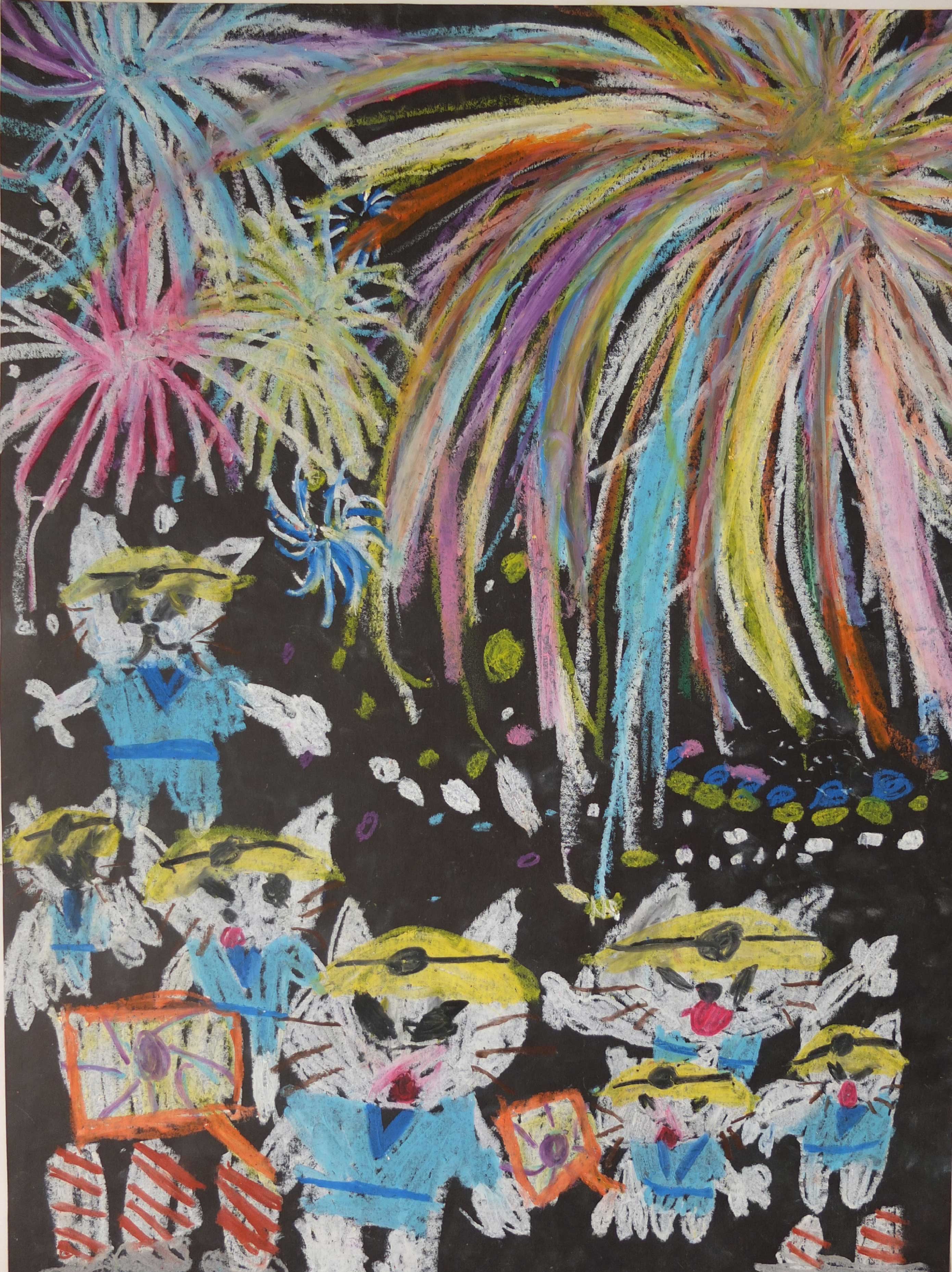 ねこの花火屋さんたちが花火大会をしているよ。しろねこぐみは大きな花火をたくさんうちあげて大よろこびしているよ。