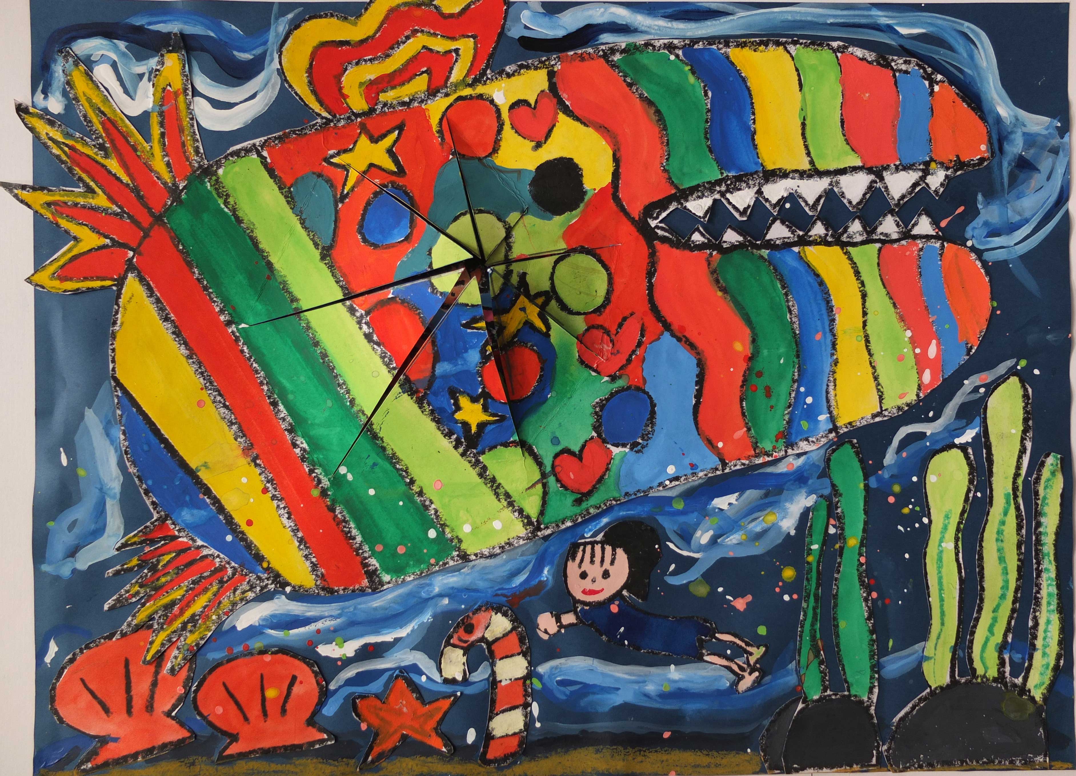 にじの下でたのしくあそぶようすをそうぞうしている魚をかきました。